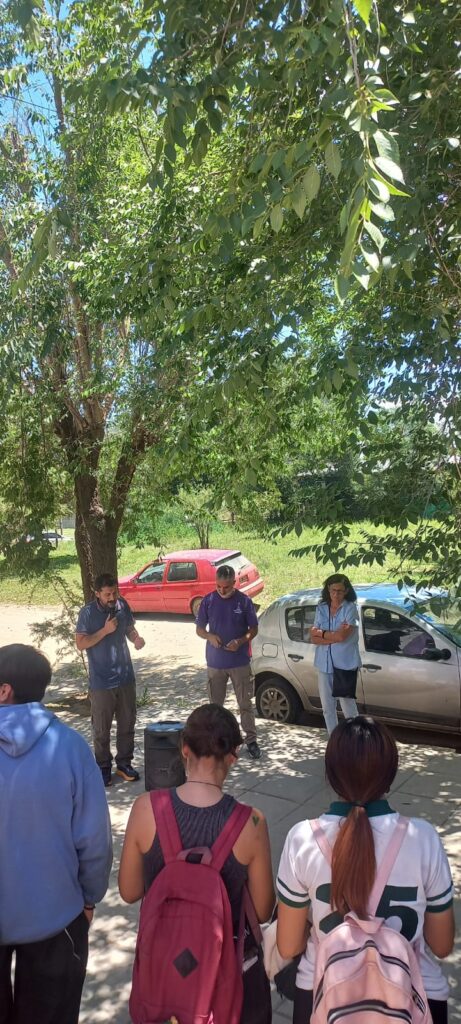 El abrazo simbólico contó con una amplia participación de familias y estudiantes. “Es imprescindible el acompañamiento de las familias. Si no, queda como un reclamo docente y pierde fuerza”, expresó el delegado.